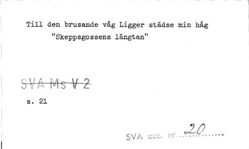 //// Till den brusande våg Ligger städse min håg "Skeppsgossens längtan" //// S-V A Ms V £ //// s. 21 //// rZO //// SVA ccc. nr ."trtt... ////