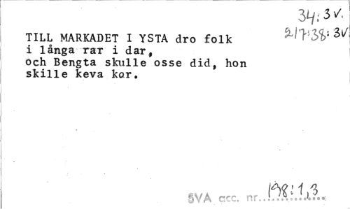 //// 3 ty 3* //// TILL MARKADET I YSTA dro folk ~ ^ //// i långa rar i dar, //// och Bengta skulle osse did, hon //// skille keva kar. //// §VA ccc. ////