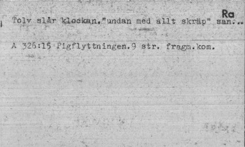 //// Ra //// t Tolv slår klockan, "undan med allt skräp" san... A 326:15 Pigflyttningen.9 str. fragm.kom. //// - - ... • • **¦/ • ////
