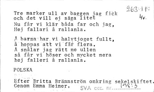 //// Tre marker ull av baggen jag fick , //// och det vill ej säga litet Hi/- //// Nu får vi klär båda far och jag, Hej fallari å rallanla. //// Å barna har vi halvtjoget fullt, å hoppas att vi får flera. Å snålar jag rätt me ullen så får vi höser och mycket mera hej falleri å rallanla. //// POLSKA //// Efter Britta Brännström omkring sekelskiftet Genom Emma Heimer. gy^ ccc nr...\T! ////