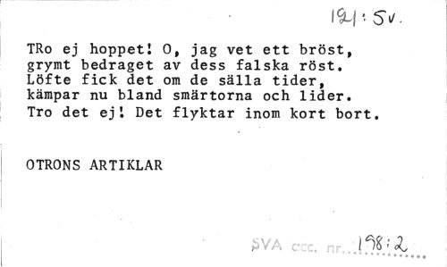 //// TRo ej hoppeti O, jag vet ett bröst, grymt bedraget av dess falska röst. Löfte fick det om de sälla tider, kämpar nu bland smärtorna och lider. Tro det ej 1 Det flyktar inom kort bort. //// OTRONS ARTIKLAR //// SVA c ;. l^-l ////
