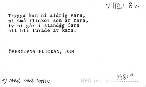//// k) m //// Trygga kan ni aldrig vara, ni små flickor som är rara, ty ni går i ständgg fara att bli lurade av kara. //// ÖVERGIVNA FLICKAN, DEN //// *) mAi iMcy sv/ 1 ... ////