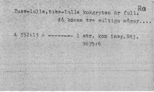 //// Ra //// Tuss-lulle,tuss-lulle kokgrytan är full, //// då kömme tre sultiga mågar.,.. //// A 352:13 c---1 str. kom insp.Rtj. //// 9695:6 ////