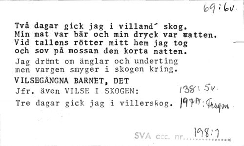 //// bc] ' vi/- //// Två dagar gick jag i villand' skog. Min mat var bär och min dryck var scatten. Vid tallens rötter mitt hem jag tog — //// och sov på mossan den korta natten. //// Jag drömt om änglar och underting men vargen smyger i skogen kring. //// VILSEGÅNGNA BARNET, DET //// Jfr. även VILSE I SKOGEN: //// Tre dagar gick jag i villersRog. //// SVA c nr Wl //// ¦ • •••»...*••« ////