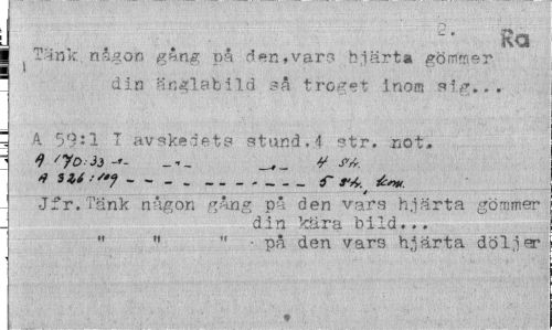 //// Ra //// I Tänk. någon gäng på den,vars bjärta gömmer din ringlabild aå troget inom sig... //// ^ A 59:1 I avskedets stund.4 str. not. //// s*/.-/?---^ //// / //// Jfr. Tänk någon gång på den vars h.iärta gömmer //// din kära bild... " " " - på den var3 hjärta döljer ////