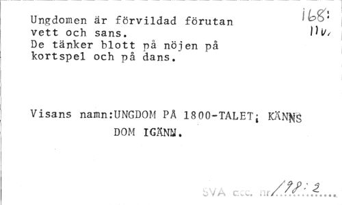 //// i t //// Ungdomen är förvildad förutan n //// vett och sans. De tänker blott på nöjen på kortspel och på dans. //// Visans namn:UNGDOM PÅ 1800-TALETj KäN^S DOM IGÄNN. //// ,VA C.., ... ////