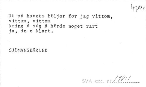 //// iftyn- v. //// Ut på havets böljor for jag vittom, v ittom, vittom //// kring å såg å hörde noget rart ia, de e klart. //// SJÖMANSKÄRLEK //// SVA c--, nr ///.i/... ////