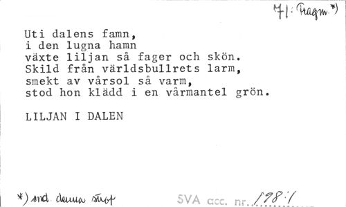 //// ^J-j- Rfi^Vto ) //// Uti dalens faran, //// i den lugna hamn //// växte liljan så fager och skön. //// Skild från världsbullrets larm, //// smekt av vårsol så varm, //// stod hon klädd i en vårmantel grön. //// LILJAN I DALEN //// dsxmioo SVA c /7f Y ////