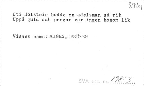 //// m.| //// Uti Holstein bodde en adelsman så rik Uppå guld och pengar var ingen honom lik //// Visans namn: AGNES,, FRÖKEN //// SVA ccc. nr ////
