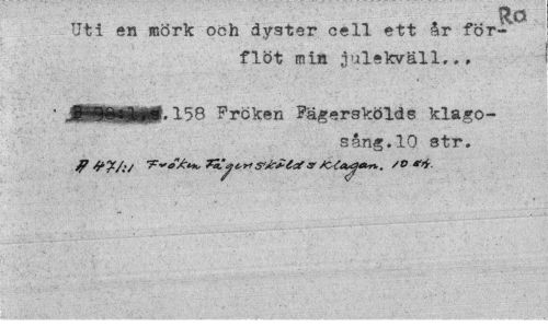 //// Ko //// Uti en mörk och dyster cell ett år förflöt min julekväll.., //// ' J0MiMf.<158 Fröken Fägerskölds klagosång. 10 str. //// tf T-*»/:»*, Tkyc-r>s K-ia^tun. /£> ////