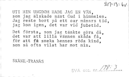 //// wiy ti/. //// UTI MIN UNGDOM HADE JAG EN VÄN, som jag älskade näst Gud i himmelen. Jag reste bort på ett oar månars tid, jag kom igen, det var vid juletid. //// Det första, som jag tänkte §öra då, det var att lilla vännen skåda få, för att få smeka hennes röda kind, som så ofta vilat har mot min. //// SKÅNE.-TRANÅS //// SVA ccc. nr/Zff.lÄ.,,, ////