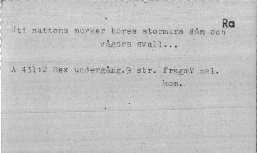 //// Ra //// It i nattens mörker höres stormars dån och //// vågors svall... //// A 431 ".2 Rex undergång.9 str. fragm? mel. //// kom. //// . ////