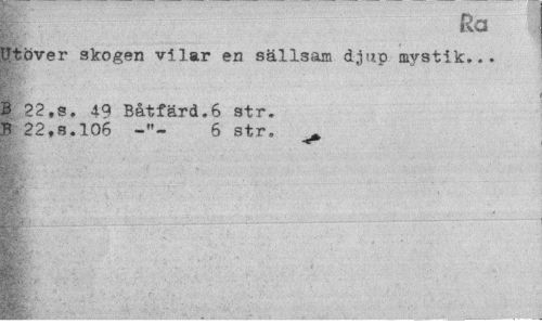 //// Ra //// Jtöver skogen vilar en sällsam djup mystik... //// B 22,s. 40 Båtfärd.6 str. B: 22,s. 106 6 str. ^ ////