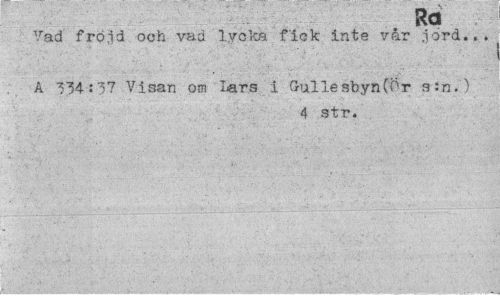 //// - Ra //// Vad f rond och vad l.vckö fick inte vår .jord... //// . A 334:3? Visan om Lars i Gul le sbynCÖr s:n.) //// 4 str. ////