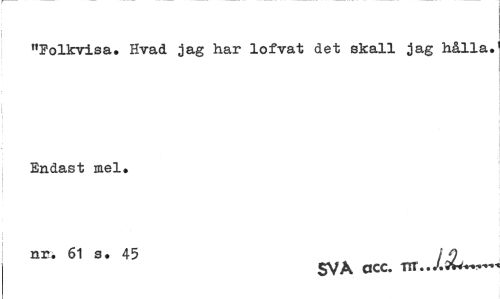 //// "Folkvisa. Hvad jag har lofvat det skall jag hålla. Endast mel. //// nr. 61 s. 45 jQ //// SVA acc. ////