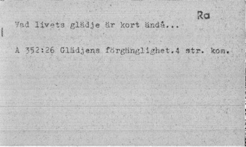 //// Ra //// Vad livets glädje är kort ändå,,. //// i . .. j //// A 352:26 Glädjens förgänglighet.4 str. kora. ////
