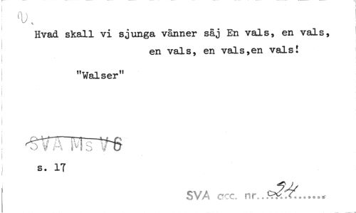//// Hvad skall vi sjunga vänner säj En vals, en vals, //// en vals, en vals,en vals! //// "Walser" //// | //// ov A Ms VH //// ¦ //// s. 17 //// SVA ccc. nr. ////