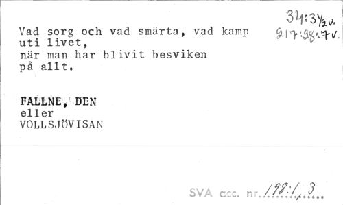 //// 3V.3V- //// Vad sorg och vad smärta, vad kamp uti livet, //// när man har blivit besviken på allt. //// FALLNE, DEN //// eller //// VOLLSJÖVISAN //// SVA ccc. nr. ////