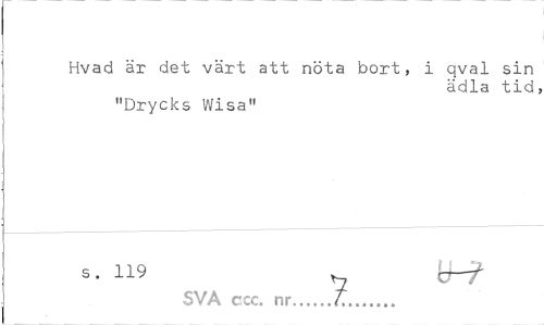 //// Hvad är det värt att nöta bort, i qval sin //// ädla tid; //// "Drycks Wisa" //// SVA ccc. nr...t... ////