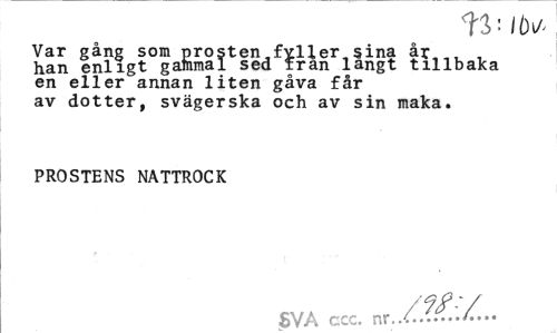 //// Var gång som prosten fyller,sina år . , han enligt gammal sed frän långt tillbaka en eller annan liten gåva får av dotter, svägerska och av sin maka. //// PROSTENS NATTROCK //// SVA ccc. ////