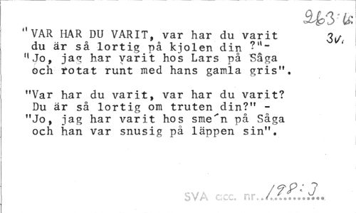 //// U, //// "VAR HAR DU VARIT, var har du varit //// du är så lortig på kjolen din "Jo, jaq har varit hos Lars på Såga och fotat runt med hans gamla gris". //// "Var har du varit, var har du varit? //// Du är så lortig om truten din?" -"Jo, jag har varit hos sme"*n på Såga och han var snusig på läppen sin". //// SVA ccc. -ar..2.. ////