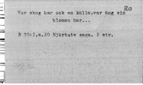 //// ^ mBmm ¦ //// J Var skog har ock en kalla,var äng sin ~ blomma har.,. //// — 3 70:2,s.20 Hjärtats saga, 2 str. //// ¦if ////