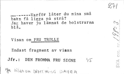 //// ___Varför låter du mina små //// bafcn få ligga på strå? //// Jag haver ju lämnat de bolstrarna o-0 //// blå. //// Visan om FRU TROLLE X //// Endast fragment av visan Jfr.: DEN FROMMA FRU SIGNE 7S" //// 1/5 //// 1K ViSihOWv öewrMVHG D Ari fl l\ ////