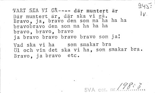 //// ¦VART SJA VI GÄ---där muntert är , //// Där muntert ar, där ska vi gå. Bravo, ja, bravo den som ma"ha ha ha bravobravo den som ma ha ha ha bravo, bravo, bravo ja bravo bravo bravo bravo som ja! //// Vad ska vi ha som smakar bra //// Öl och vin det ska vi ha, som smakar bra. //// Bravo, ja bravo etc. //// fiVÅ c,c. /.Zf.LLs ////