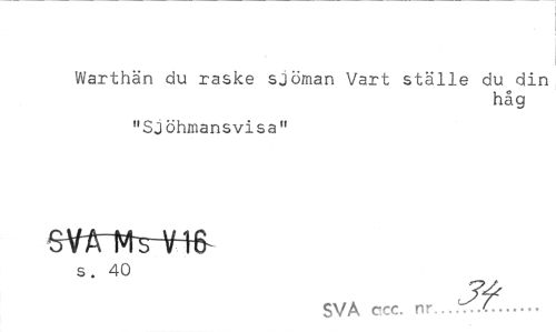 //// Warthän du raske sjöman Vart ställe du din //// håg //// "Sjöhmansvisa" //// svAi^s-m //// s. 40 //// SVA ccc. nr...'... ////