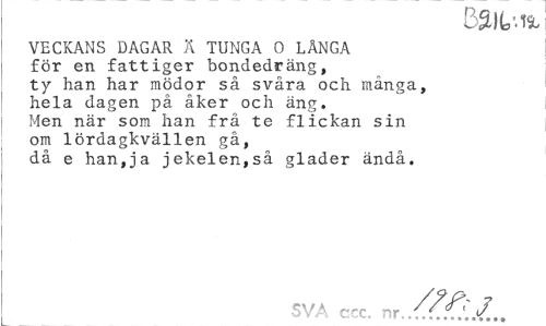 //// im-.is, //// VECKANS DAGAR Ä TUNGA O LÅNGA //// för en fattiger bondedräng, //// ty han har mödor så svåra och många, //// hela dagen på åker och äng. //// Men när som han frå te flickan sin //// om lördagkvällen gå, //// då e han,ja jekelen,så gläder ändå. //// SVA ccc. ////