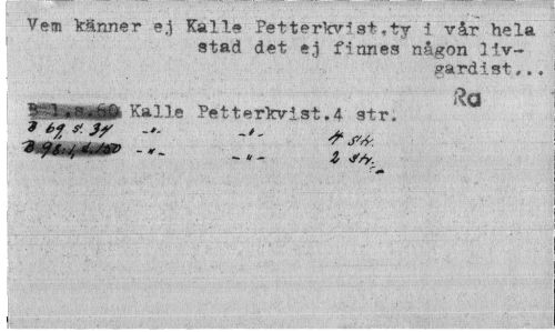 //// i Vem känner e.i Kalle Petterkvist,ty i vår hela i stad det e.j finnes någon liv- //// gardist #.. //// ~ fca //// Kalle Petterkvist .4 str. ////