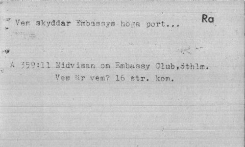 //// Ra //// v Vem skyddar Bmbassys hö;ra port... //// A 559:11 Kidvisan om Embassy G1ub,Sth1m. Vem :;.r vem? 16 str. kom. ////