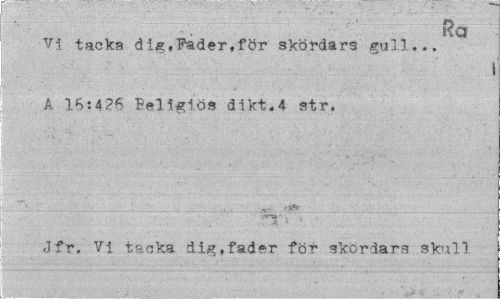 //// kq //// Vi tacka dis,Fader,för skördars gäll... //// I //// A 16:4?6 Eeligiös dikt.4 str. //// ¦ jr**" //// . .. . ... .'. .. . . . . //// Jfr, Vi tacka dig,fader för skördars skull ////
