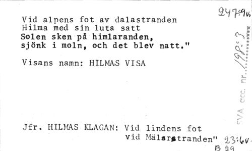 //// Vid alpens fot av dalastranden Hilma med sin luta satt Solen sken på himlaranden, //// sjönk i moln, och det blev natt." <v : //// Visans namn: HILMAS VISA X: //// c //// O //// ¦s. //// r* //// Jfr. HILMAS KLAGAN: Vid lindens fot //// vid Mälarstranden" //// tX cm ////