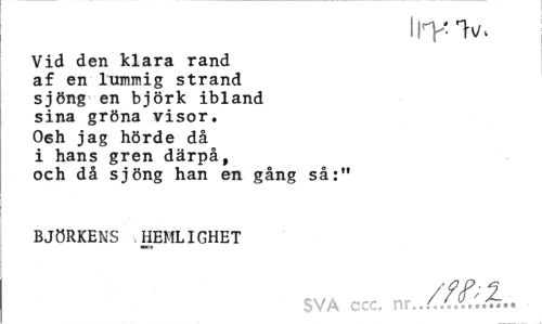 //// Vid den klara rand //// af en lummig strand //// sjöng en björk ibland //// sina gröna visor. //// Osh jag hörde då //// i hans gren därpå, //// och då sjöng han en gång så:'* //// BJÖRKENS HEMLIGHET //// SVÅ ccc. ////