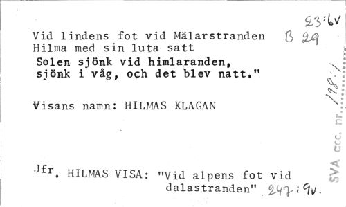 //// Vid lindens fot vid Mälarstranden 5 <$J\ Hilma med sin luta satt //// Solen sjönk vid himlaranden, N //// sjönk i våg, och det blev natt." //// Visans namn: HILMAS KLAGAN ^ //// C //// o //// v //// Jfr. HILMAS VISA: "Vid alpens fot vid //// dalastranden" °1\J. ////