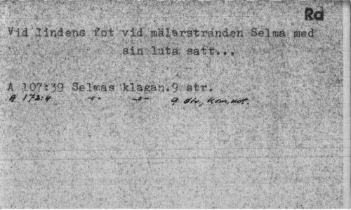 //// Ref //// Vid lindens fot vid .wUlarstränd^n Selma med //// .:?> * ,k.; - . v-1 - sin luta. saft. ¦ •• ^ //// A 107:39 Selmas klagan.9 str. ////