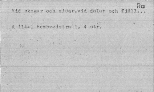 //// Ra //// Vid skogar, och si öar, vid dalar och fjäll... A 114-1 Hembvgdstrall. 4 str. ////