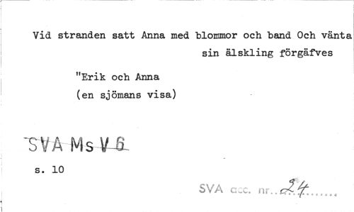 //// Vid stranden satt Anna med blommor och band Och vänta //// sin älskling förgäfves //// "Erik och Anna (en sjömans visa) //// "SVA Ms VH //// s. 10 //// SVA ccc. nr..*<f£... ////