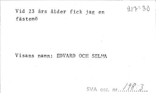 //// Vid 23 års ålder fick iag en 4 " v fästemö //// Visans namn: EDVARD OCH SELMA //// SVA ccc. nr../f<f'J... ////