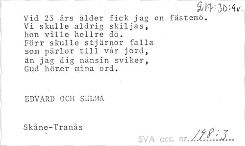 //// Vid 23 års ålder fick jag en fästemö. //// Vi skulle aldrig skiljas, //// hon ville hellre dö. //// Förr skulle stjärnor falla //// som pärlor till vår jord, //// än jag dig nånsin sviker, //// Gud hörer mina ord. //// EDVARD OCH SELMA //// Skåne-Tranås , ^ . ^ //// SVA ccc, nr.//.f..:J... ////