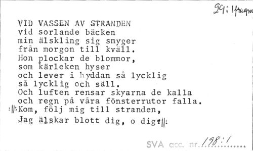 //// VID VASSEN AV STRANDEN vid sorlande bäcken min älskling sig smyger från morgon till kväll. Hon plockar de blommor, som kärleken hyser och lever i hyddan så lycklig så lycklig och säll. Och luften rensar skyarna de kalla och regn på våra fönsterrutor falla. i|J''Kom, följ mig till stranden, //// Jag äjskar blott dig, o digfjj; //// SVA ccc. nr...Ay... ////