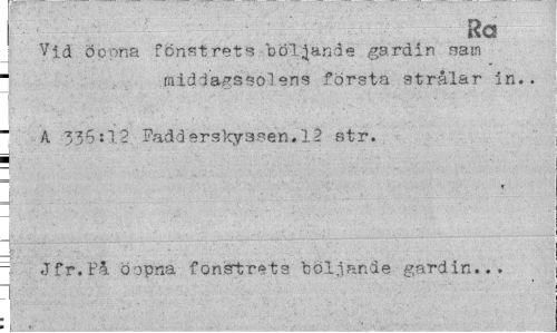 //// Ra //// Vid Öppna fönstrets böljande gardin nam //// middagssolens första strålar in.. //// " A 336:12 Fadderskyssen.12 str. i //// < //// 7 Jfr.Få öopna fonsrtrets boliande gardin... , . ////