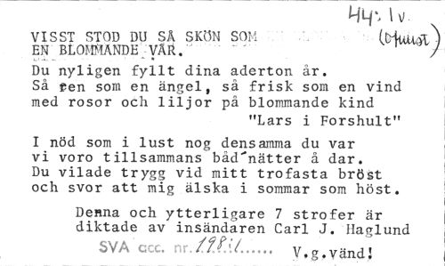 //// HLf' \ M //// VISST STOD DU SÅ SKÖN SOM OHttUaO //// EN BLOMANDE VÄR. / //// l/ -i. ~ •¦¦¦¦•¦..•'• * • //// Du nyligen fyllt dina aderton år. //// Så fen som en ängel, så frisk som en vind //// med rosor och liljor på blommande kind //// "Lars i Forshult" //// I nöd som i lust nog densamma du var vi voro tillsammans båd"nätter å dar. Du vilade trygg vid mitt trofasta bröst och svor att mig älska i sommar som höst. //// Denna och ytterligare 7 strofer är diktade av insändaren Carl J. Haglund //// SVA ccc. x\x./.fJ.\L... V. g. vänd I ////