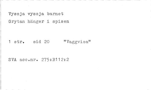 //// Vyssja vyssja barnet Grytan hänger i spisen //// 1 str. sid 20 "Vaggvisa" //// SVA acc.nr. 275:B112:2 ////