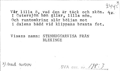 //// Vår lilla ö, vad den är täck och skön. I Östersjön hon gilar, lilla mön. //// Och runtomkring slår böljan mot i dalens bädd vid klippans branta fot. //// Visans namn: STENHUGGARVISA FRÄN BLEKINGE //// >J<SVA ccr rr ////