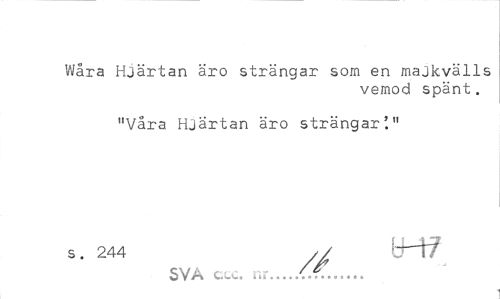 //// Wåra Hjärtan äro strängar som en majkvälls //// vemod spänt. //// "Våra Hjärtan äro strängar'." //// s. 244 // :-Tr //// SVA ccc. ia...( ... ////