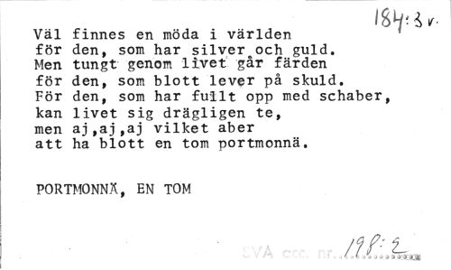 //// IWir- //// Väl finnes en möda i världen //// för den, som har silver och guld. //// Men tungt genom livet går färden //// för den, som blott lever på skuld. //// För den, som har fullt opp med schaber, //// kan livet sig drägligen te, //// men aj,aj,aj vilket aber //// att ha blott en tom portmonnä. //// PORTMONNÄ, EN TOM //// /?/•' t-' t a1» »»'X3CM ////