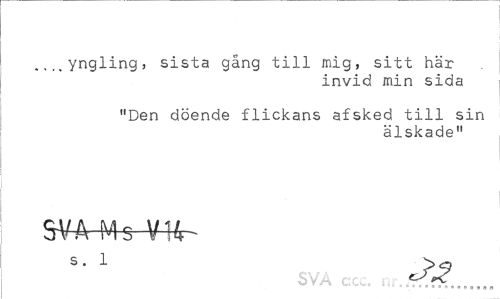 //// ...yngling, sista gång till mig, sitt här //// invid min sida //// "Den döende flickans afsked till sin //// älskade" //// SVA Ms //// s. 1 //// SV, ////