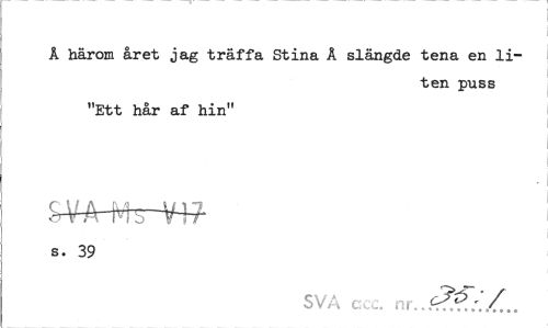 //// Å härom året jag träffa Stina Å slängde tena en liten puss //// "Ett hår af hin" //// SAMHfcrW //// s. 39 //// SVA ccc. nr //// Ä.i ////